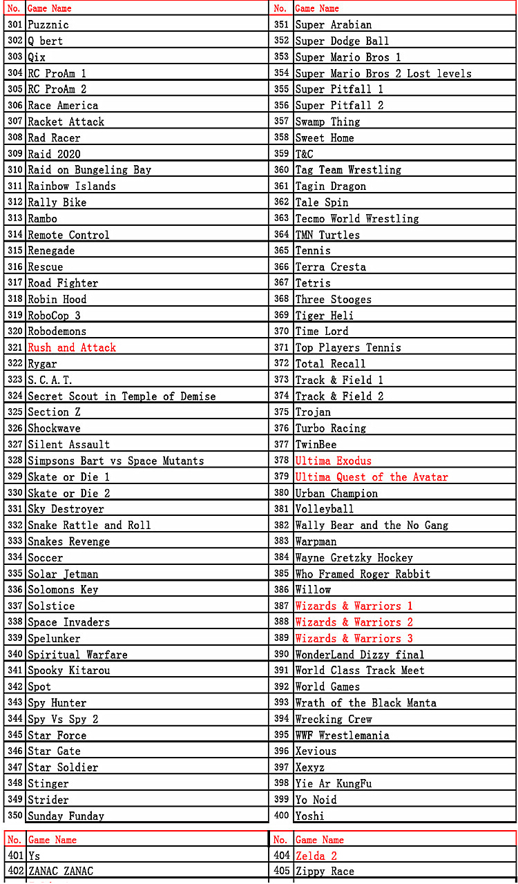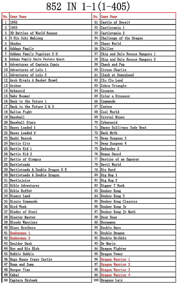 Menu 405 in 1 Games List: