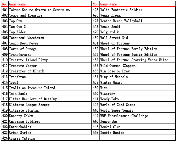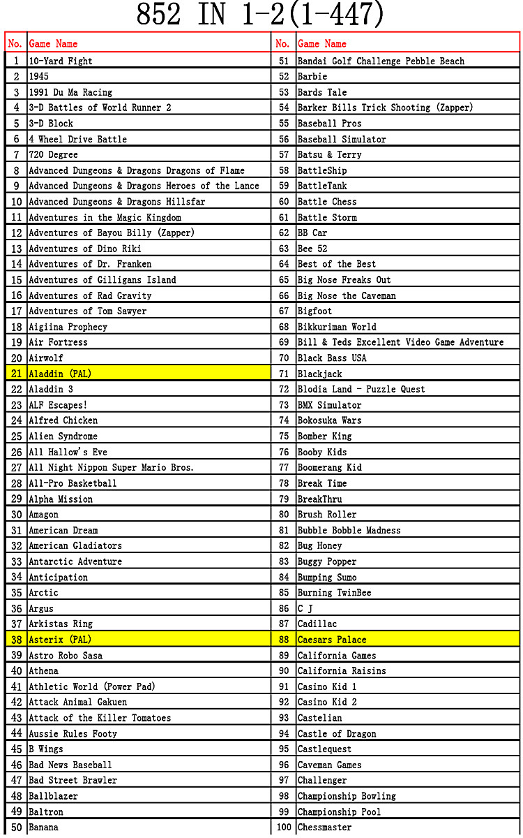 Menu 447 in 1 Games List: