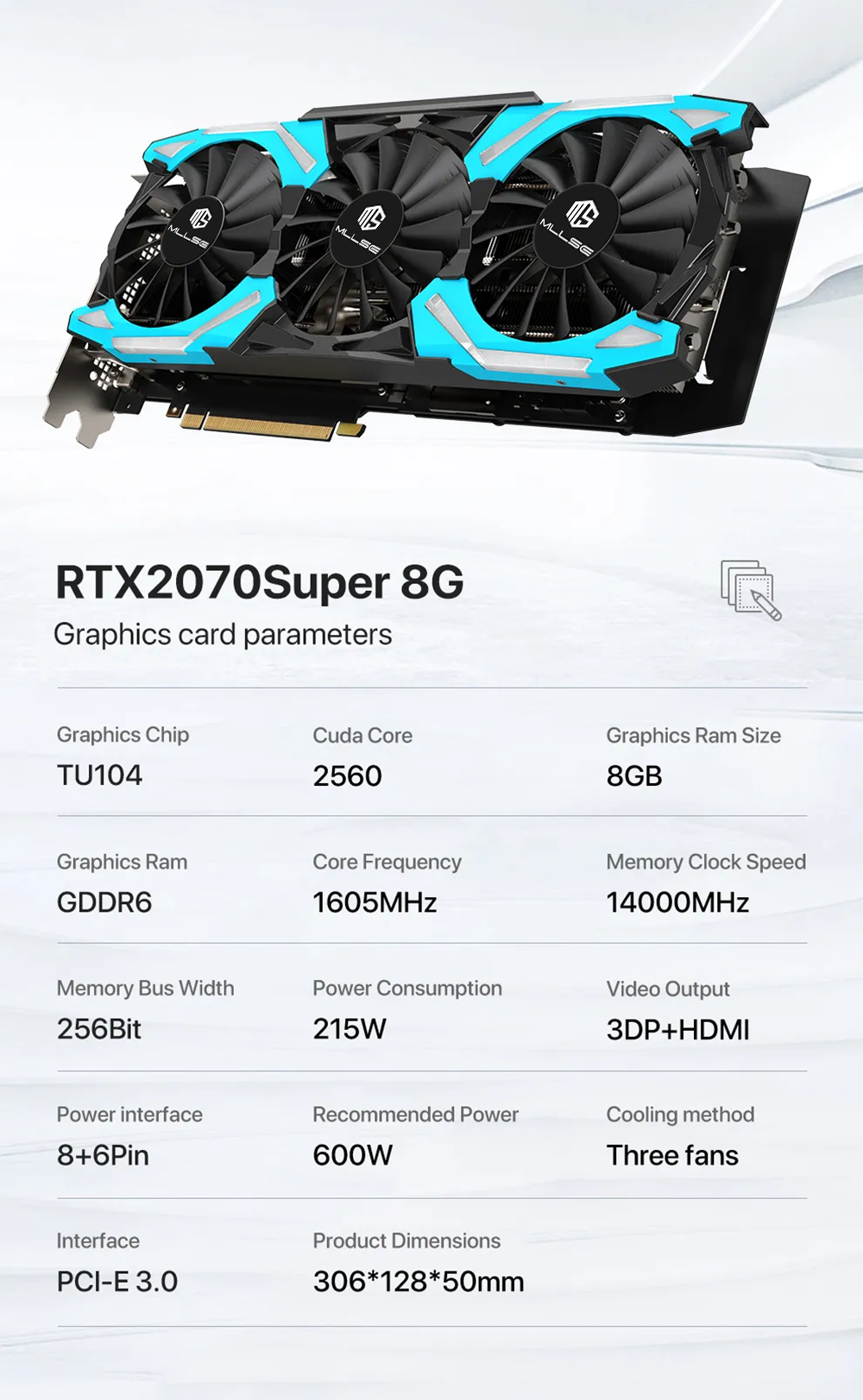 MLLSE RTX 2070 Super Graphics Card 8GB 256Bit GDDR6 HDMI*1 DP*3 PCIE PCI-E3.0 16X NVIDIA GeForce rtx2070super Gaming Video Card