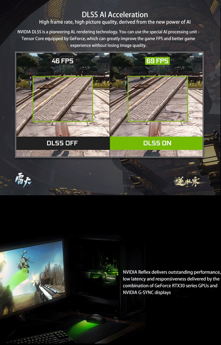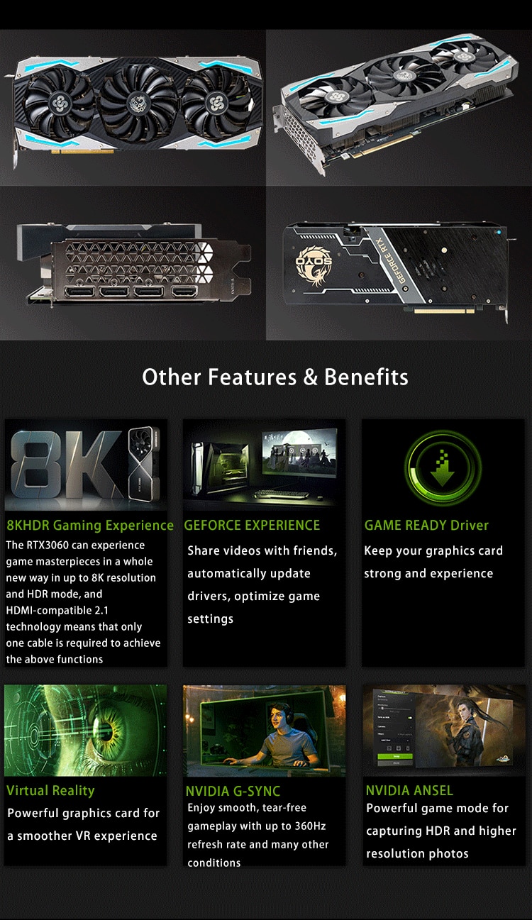 Features:Support Simultaneous Multi–ProjectionVR image correction technology,VRWorks Audio virtual reality audio technology,Ansescreenshot function, PhysX physics acceleration technology, NVIDIA CUDA,NVIDIA REFLEX,PureVideo HD high definition hardware decoding,dynamic super resolution, MFAA,GeForce 3D Vision,GameWorksTM, G-SyncTM Ready,GameStreamTM-Ready, GeForce
