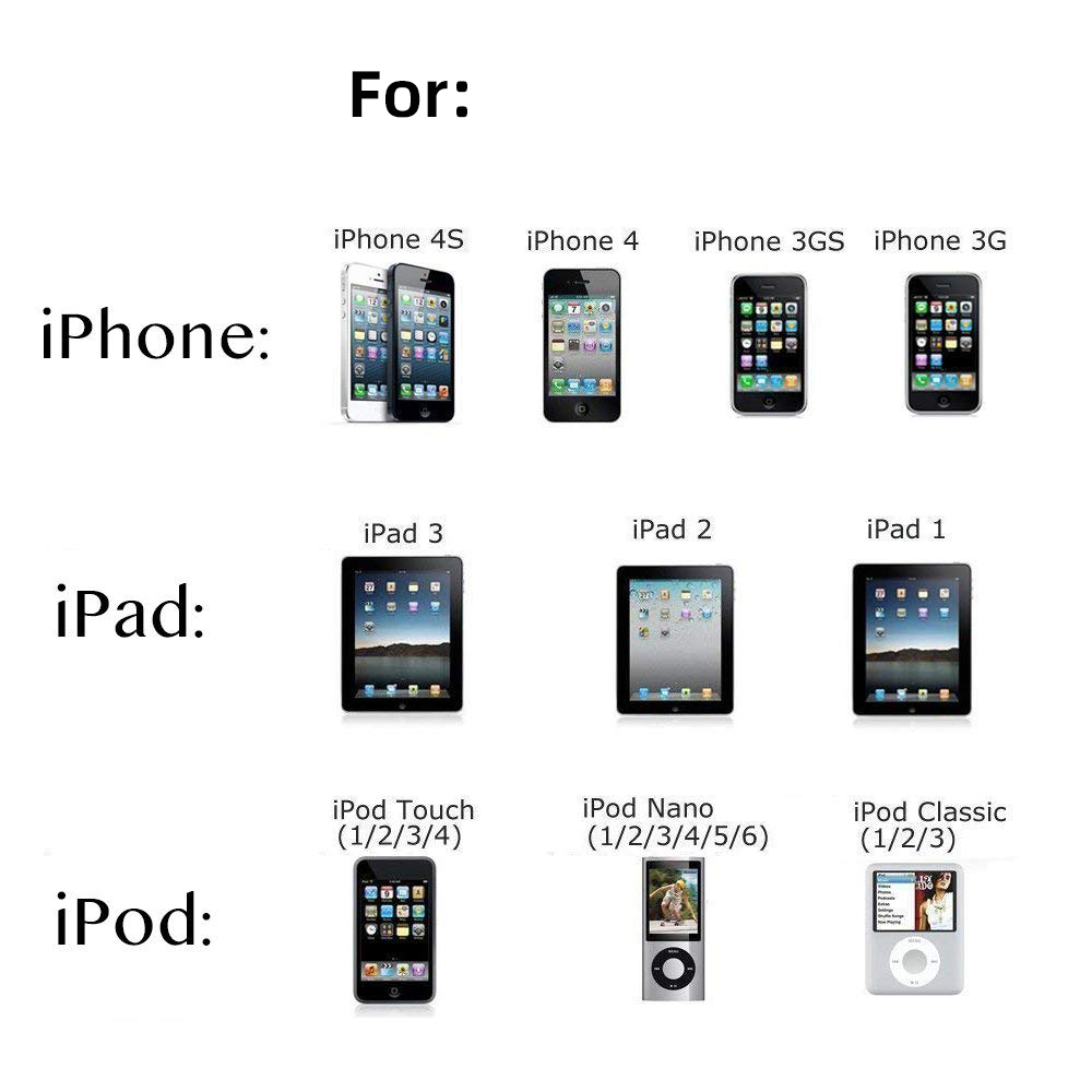 Compatible with iPhone 4/4S, iPhone 3G/3GS, iPad 1/2/3, iPod, iPod Nanos